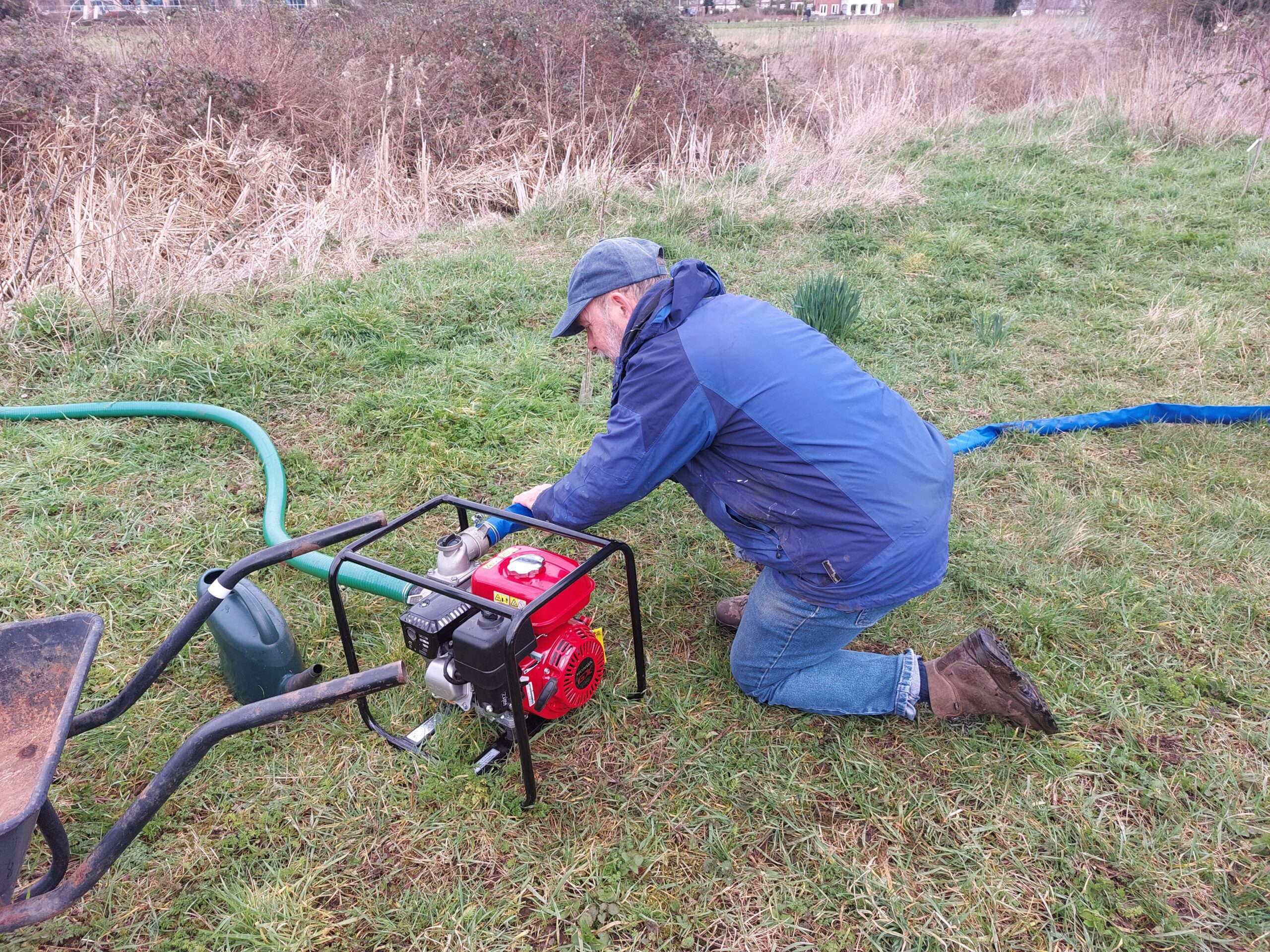When the river is high there is water in the dyke which we can use to top up the pond. We’ll also use the pump for watering trees along the riverside path.