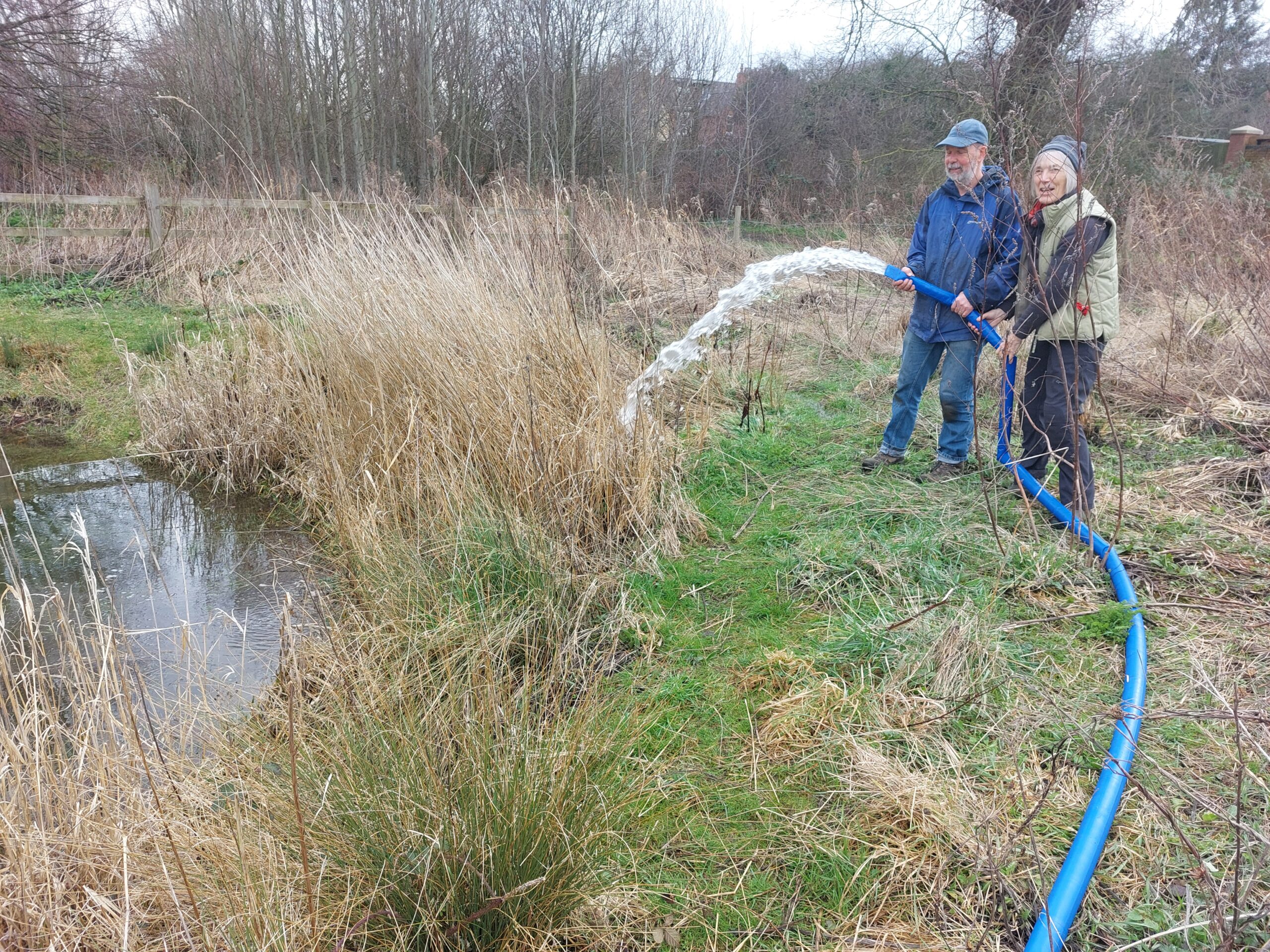 The Wildlife Pond is full and frogs are already there and mating. A huge thanks to everyone who made this happen: to the band Morris Convertible who played two fundraising gigs to raise £600 for a powerful pump and to all the volunteers from Friends of The Hook who sorted out the practicalities to get water from the dyke to the pond.