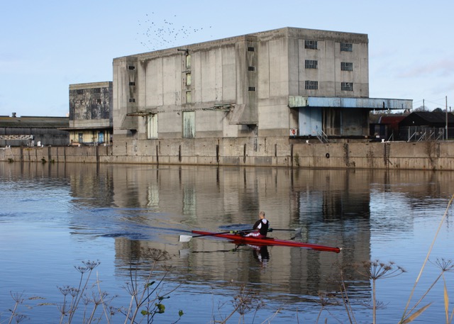 The concrete structures of the No.1 and No.2 Trent Depot warehouses were a prominent sight opposite The Hook, until their eventual demolition in 2012 (photo courtesy A Rowe). The site has now been developed as a riverside residential district, with the proposal for a new pedestrian footbridge linking the basin entrance to the south riverside path. At the time of writing (Dec2023) the groundworks for the bridge were under investigation.