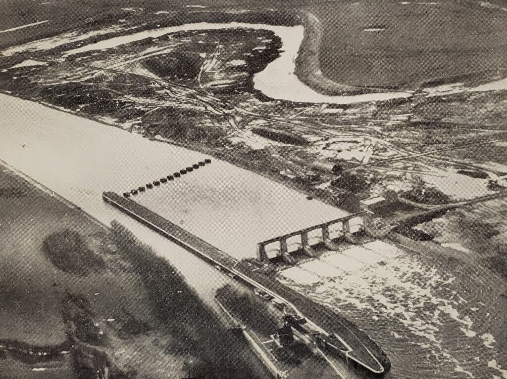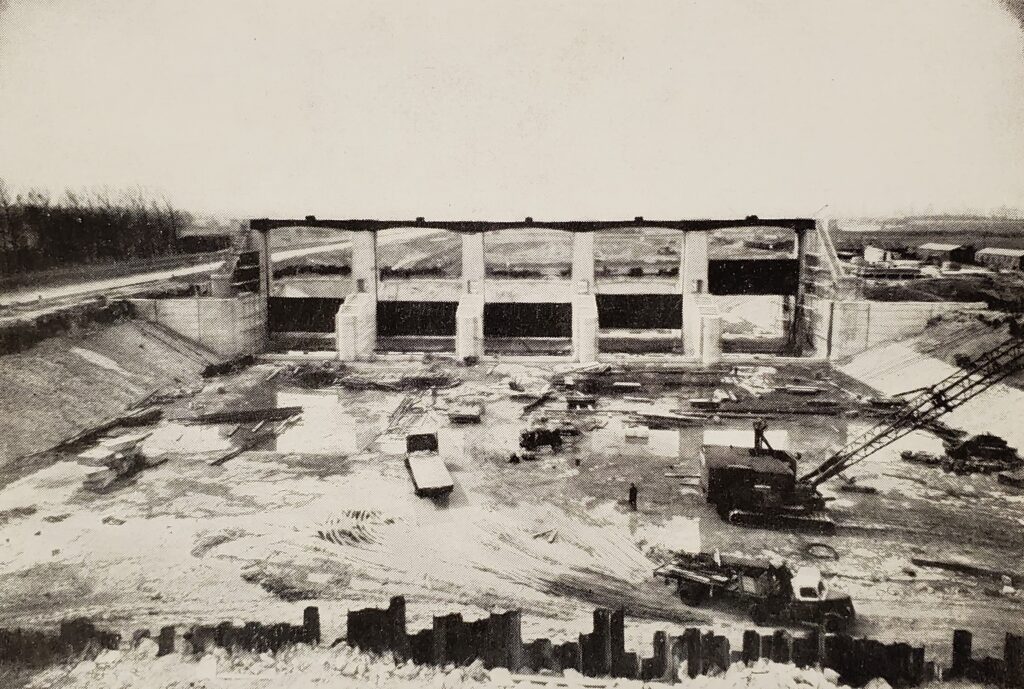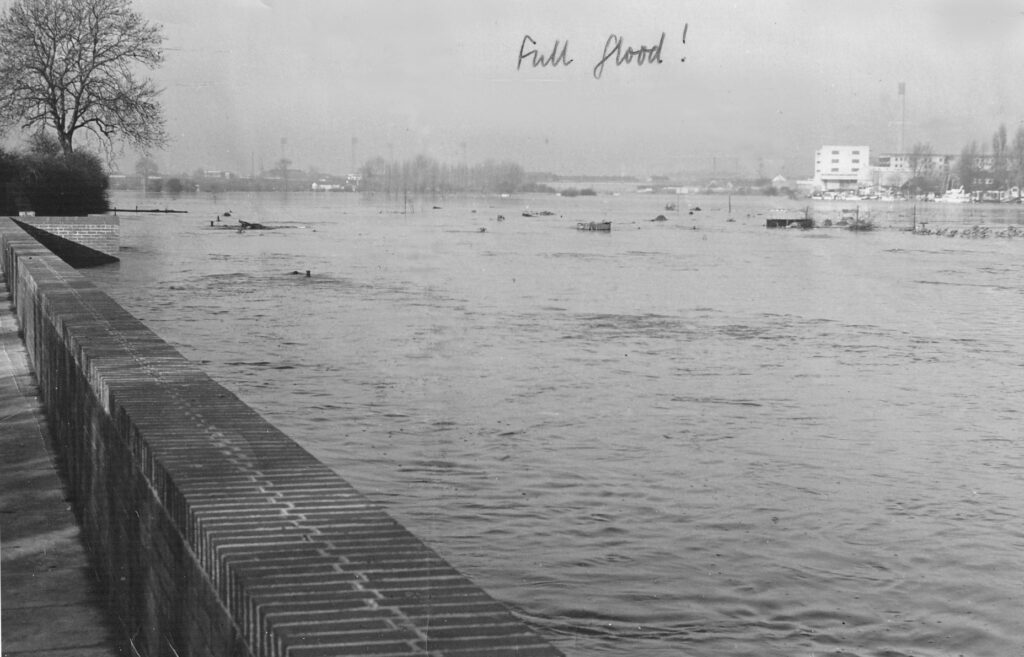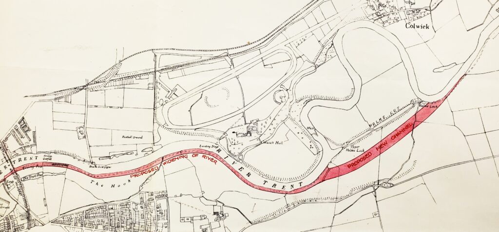 This 1947 sketch shows early proposals for a new river channel and river widening up to Lady Bay bridge, including the banks of The Hook. Later designs moved the new channel and sluices to the line of the exiting cut. The old lock is still in existence – now used for hydro-electricity generation. Ultimately around 1-2 metres were shaved from the south bank along The Hook, with reshaping of the north and south bends downstream to improve flow.