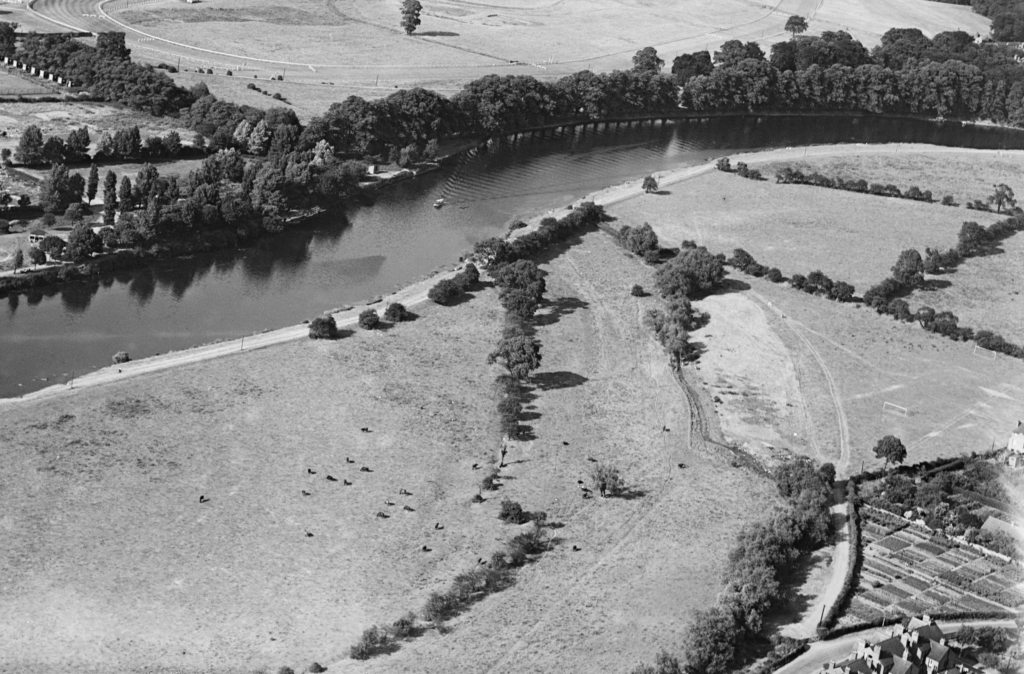 This 1934 aerial photograph shows The Hook still as an area of water meadow, with evidence of cattle grazing in the large field. However goal posts to the right of the image reveal other recreational uses and people can also be seen walking on the various footpaths. The Mona Road allotments are also seen at the bottom right of the image, although the neatness suggests that at this time the site was a market garden. The old meandering drainage ditch is still apparent, following a line of trees close to Holme Road. (photo courtesy Britain from Above)