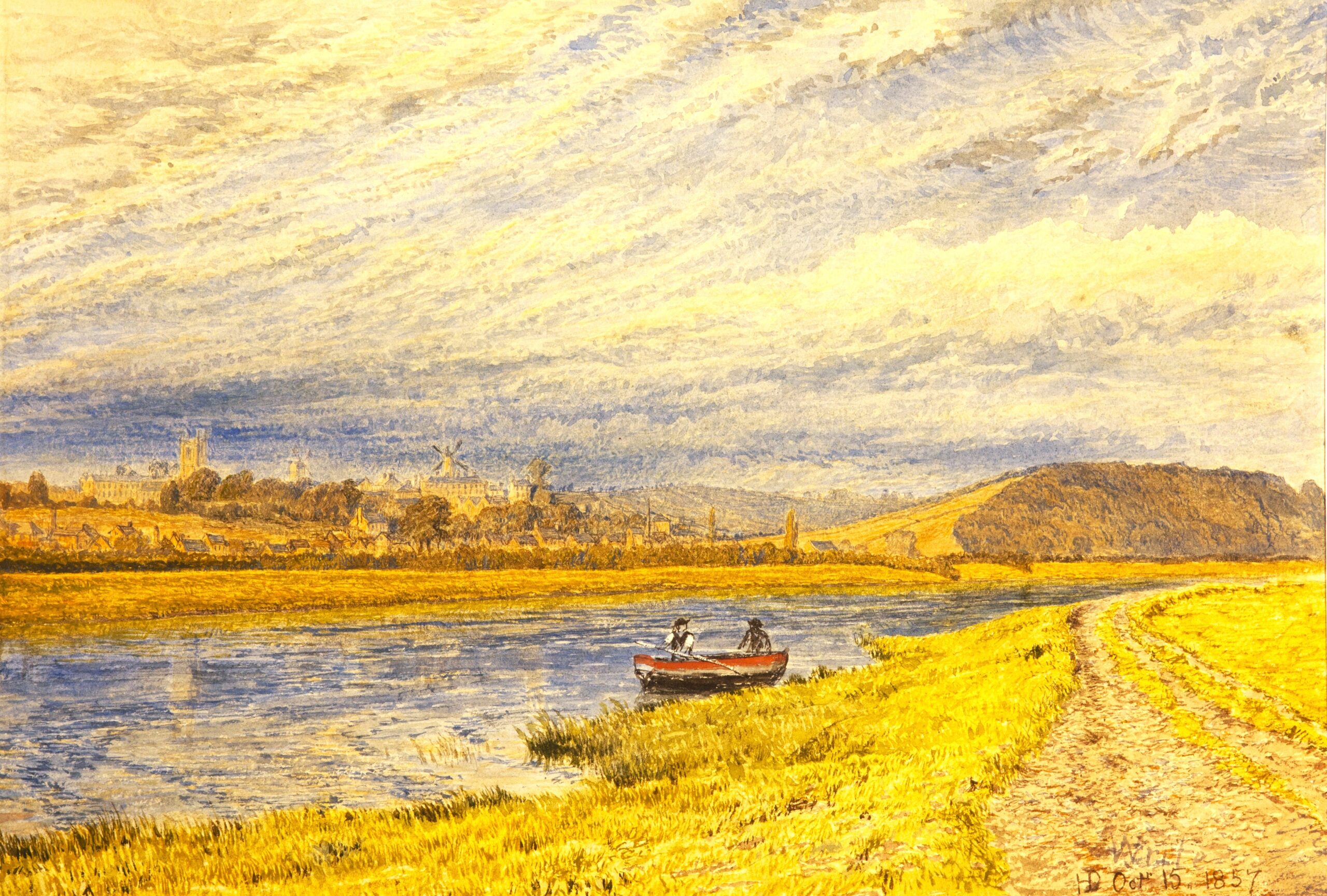 This 1865 painting by Henry Dawson shows Colwick Hill, viewed from the south bank of the Trent just upstream from The Hook (courtesy of Nottingham Museums and Galleries). Sneinton Church and Green’s mill can be seen on the opposite bank, also houses of the growing residential areas. The towing path is a reminder of the importance of the Trent for commerce, but otherwise the land along the river is still rural. The meadows appear to slope gently down to the water with no obvious flood banking.