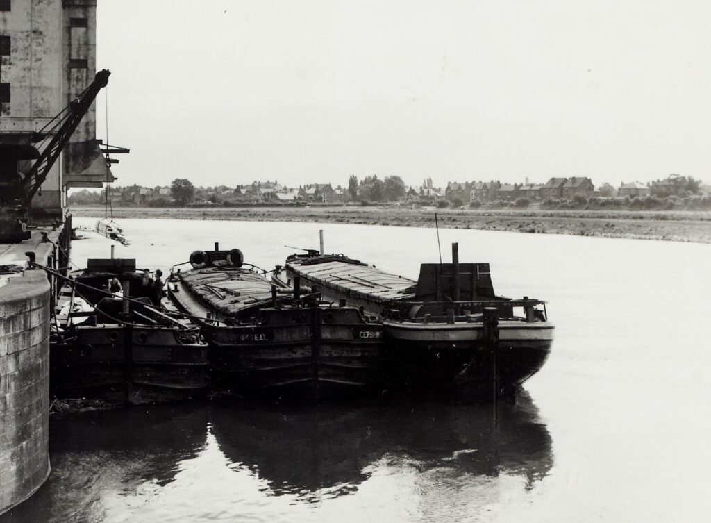 This ca1960 photo looking across towards The Hook was taken from the entrance to Trent Basin. The south bank of the river has clearly been scraped back following the 1950s flood prevention works. Comparing modern and old maps, around 1-2 metres of bank was removed. Spoils from the dredging and excavations were spread over The Hook site, flattening out the existing features, including the remnants of the old river loop. The new drainage dyke was probably cut at this time. (photo courtesy Canals and River Trust)