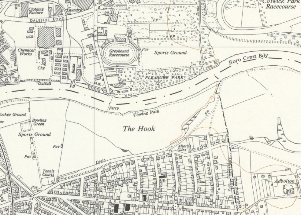 This Ordnance Survey map of 1885 shows The Hook as a defined area on the south side of the Trent. Nottingham City is to the west and Colwick hall is further along the river to the east. Holme Lane can be seen (now Holme Road) with Burrowhill Farm on the highest point of the rise. The Hook was used for cattle and sheep grazing and no doubt flooded regularly. The ditch and marshy area would have been an old river course and possibly the shape of the land gave The Hook its name. Interestingly The Hook was within the City jurisdiction until various land swaps between City and County in 1952.
