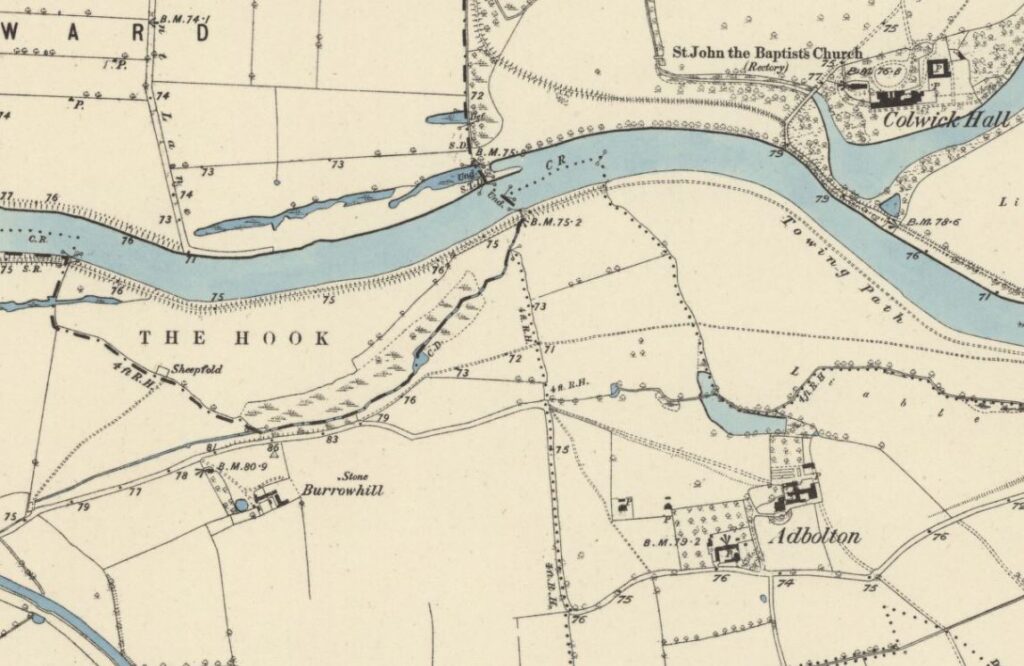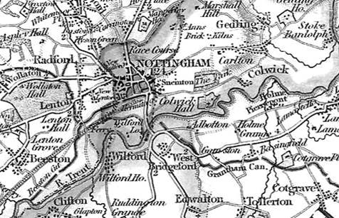 Walkers 1836 map gives an appreciation of pre-industrial Nottingham and surroundings, showing the Nottingham and Grantham canals and the early Midland Railway line, terminating in the City. (taken from nottshistory.org.uk, courtesy A.P Nicholson) The meanders of the River Trent are close to those of the present day and the village names along its banks are all recognisable. Holme Lane leads from Trent Bridge to the hamlet of Adbolton, passing by the area of The Hook.
