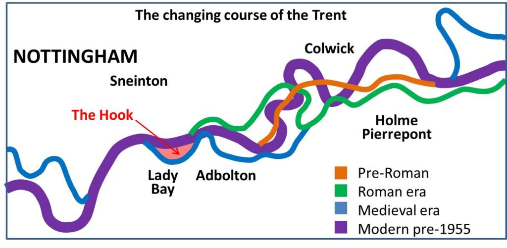 The Trent established its current flood plain at the end of the last ice age. Meandering continued within this plain, as illustrated from the graphic (from Salisbury et al. Mercian Geologist, vol9,no4, p189-207, 1984) The Hook seems to have become defined as a cut- off meander from medieval times. Human settlement of the Trent Valley occurred from the Bronze Age onwards, with the primal forest progressively cleared for cultivation. Roman era log boats were found during the excavations of the National Watersports Centre in 1967. Evidence of Norman and medieval fish weirs and later weirs and structures to aid early navigations have also been excavated.