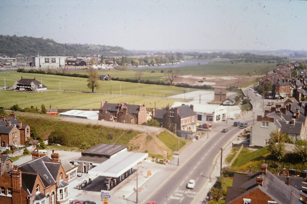 This photo taken from the top of Trent House in 1974 gives a clear view of The Hook and the adjacent Boots sports ground. The Melton Mowbray rail line has been abandoned but the embankments are still in place, showing where the bridge crossed over Radcliffe Road. The Grantham canal has been infilled at this point and a roundabout junction can be seen at the entrance to Holme Road. Drew’s garage is the white building near this junction. There is evidence of ground works at the south west corner of The Hook, which presumably would be for the construction of the carpark and the first incarnation of the play area. The rest of The Hook is still mostly devoid of trees, the space was used for travelling fairs and gymkhanas.