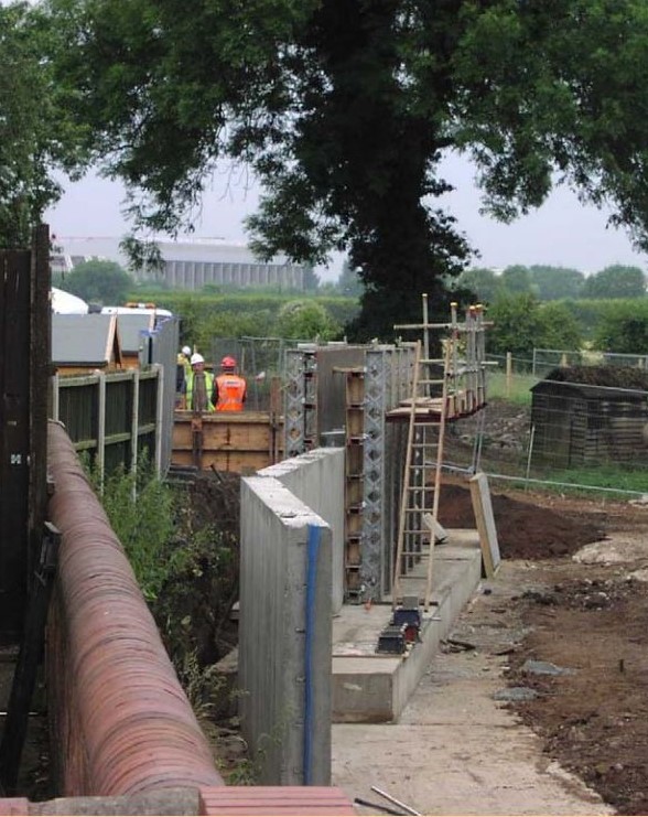 A major flood occurred again in April 2000, which almost overtopped defenses in the city. The Hook was inundated again, here viewed also from the end of Holme Grove. The dog bin on Holme Grove path indicates the depth of water. After this event plans were put in place for further enhancement of defenses, now taking into account the likely effects of global warming. The photo shows major concrete barriers being errected along the south boundary of The Hook, with remodeling of gardens along Holme Road. The City football ground can be seen in the distance.