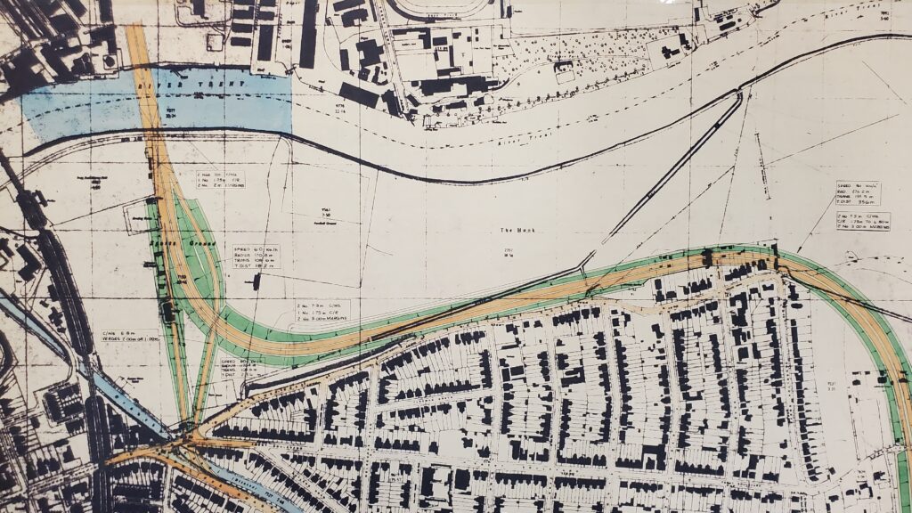 What might of been! In the brave new world of the 1950s and 1960’s proposals were put forward for an eastern Trent road crossing. Nottingham archives holds plans of various options that were postulated at an early stage in the design process. This suggested route runs along the edge of The Hook directly adjacent to Holme Road and clips the last houses at the corner of Adbolton Grove. It didnt happen! The conversion of the Lady Bay rail bridge for road traffic has hopefully taken away the necessity of anything quite as drastic!